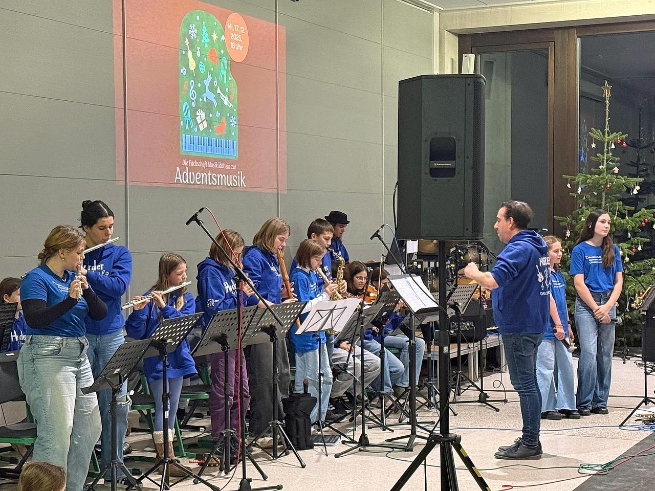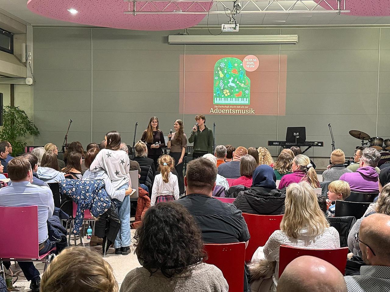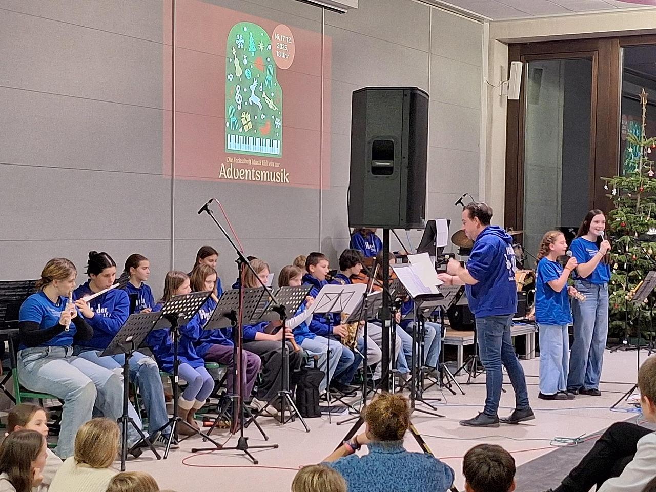 Zu einer Stunde der Besinnung lud die Fachschaft Musik der Herderschule Gießen am Mittwoch, dem 17.12.2025, in die Mensa ein. Etwa 250 Besucher lauschten der musikalischen Darbietung der Schülerschaft und des Kollegiums auf dem diesjährigen Adventskonzert.