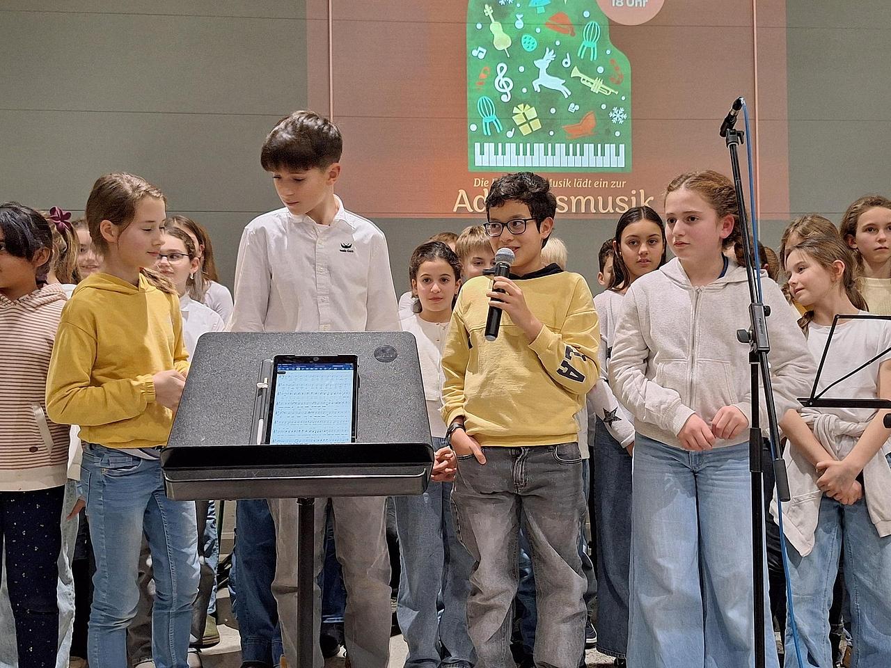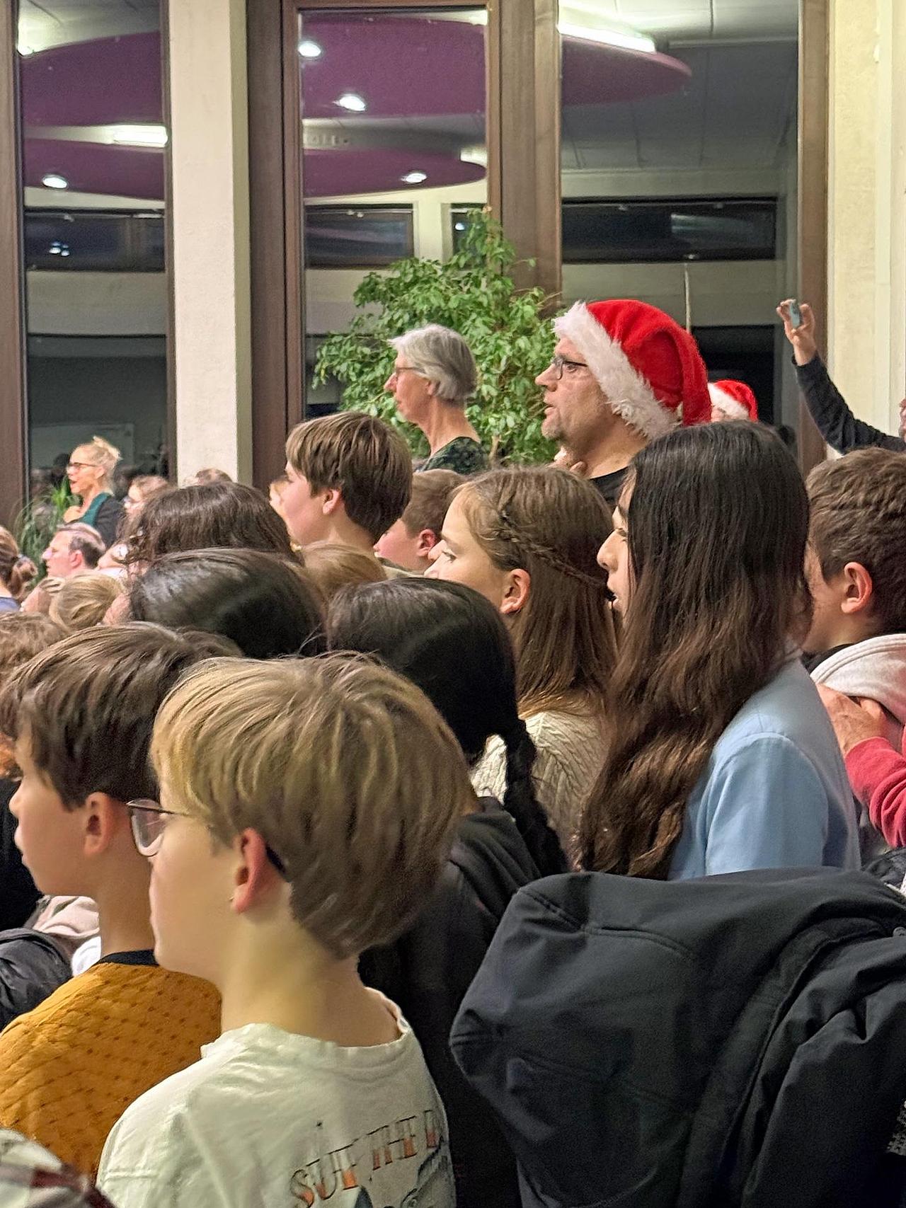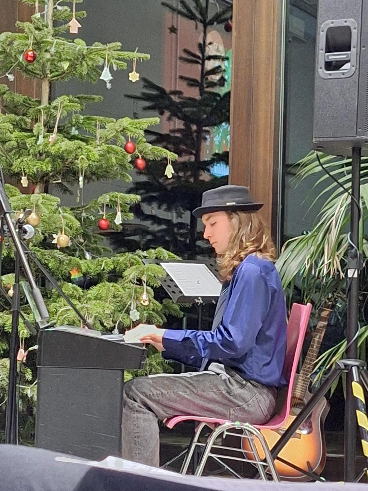 Den Auftakt bildeten die fulminanten Klänge des Orchesters „HerderTöne“ unter der Leitung von Alexander Römer, das das Publikum mit einem Medley aus Weihnachtsliedern aus aller Welt begrüßte. Dabei stachen vor allem die Streicher- und Bläsersoli hervor. In ihren Eingangsworten hob Musiklehrerin Katharina Seiler den Charakter des Konzertes hervor. Es solle einen Moment der Pause bieten in oft „anstrengenden letzten Wochen“ vor Weihnachten, in denen das Motto zwar oft Besinnung laute, während die „mentale Liste“ mit endlosen Aufgaben immer länger werde. Danach übernahmen mit Anton, Antonia und Lisa drei Mitglieder der SV die Moderation und führten gekonnt durch das Programm. Als jüngste Solistin des Abends präsentierte Elisabeth Rejditsch aus der 7. Klasse das bekannte Weihnachtslied „Jingle Bells“ am Klavier. Daran schloss sich der Chor der 5. Klassen an, der mit 120 Schülerinnen und Schülern unter Leitung von Katharina Buchert das Lied „Silber und Gold“ von Rolf Zuchowski vorsang. Dem folgte der gelungene Auftritt von Sophia Janeschik mit „Idea 10“ am Klavier. Für Stimmung sorgten die HerderJuniorVoices, die den beliebten Evergreen „Christmas Everyone“ unter Leitung von Herrn Klinke zum Besten gaben. Gänsemomente bescherten die HerderVoices, ein Chor von älteren Schülerinnen, dem Publikum mit ihrer sehr emotionalen Interpretation des Liedes „Mary, did you know“. Sanfte Melancholie erfüllte den Konzertraum, als die bekannte Titelmelodie aus dem Film „Drei Nüsse für Aschenbrödel“ von Malte Steinmetz-Bonzelius am Klavier erklang. Mit einem Liedvortrag aus dem Musical „Die Päpstin“ stellte anschließend die Neuntklässlerin Blanka Vadasz ihr Gesangstalent unter Beweis. Einen besonderen Stellenwert hatte das Vorspiel des Klavierstückes „Celui qui sait“. Hier tat sich Malte Steinmetz-Bonzelius nicht nur als Pianist hervor. Es handelte sich dabei auch um eine Eigenkomposition des Schülers und die Uraufführung seines Werks. Der Elftklässler hatte damit eine besondere Situation in seinem Leben verarbeitet und sechs Wochen für die Komposition gebraucht. Darauf folgte der Lehrerchor, der „Carols oft the Bells“ a capella vortrug. Die Rock-AG spielte das Lied „Slow, love, slow“ von Nightwish aus dem Jahr 2011. Hier brillierte Dimitrij Zyryanov an der Solo-E-Gitarre.
