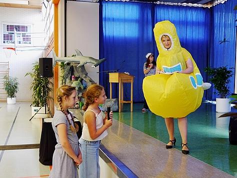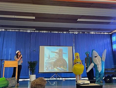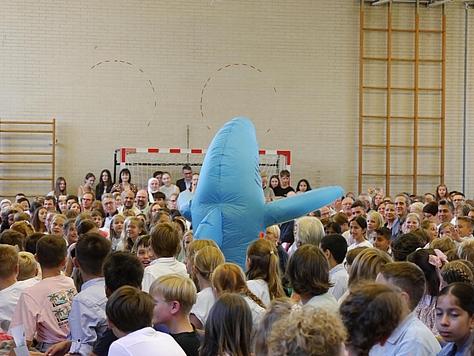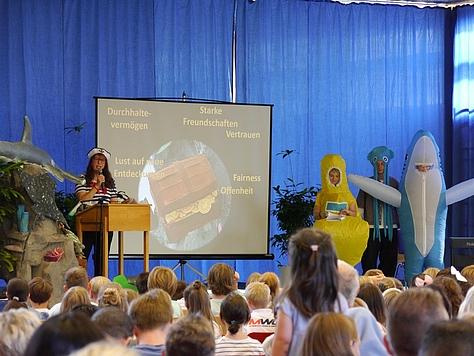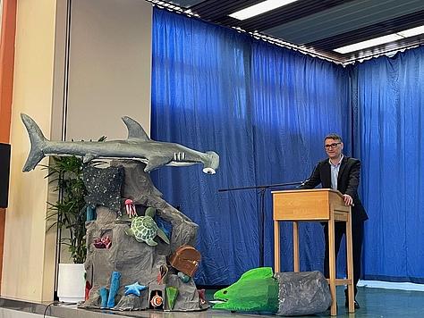 Schulleiter Stefan Tross hieß die Neuankömmlinge in seiner Rede willkommen und zeigte den neuen Fünfern darin das Ziel auf. Dabei knüpfte er an die launige Darbietung der Pädagogischen Leitung und einiger älterer Schüler an, die die Schulzeit an der Herderschule mit einer neunjährigen Unter-Wasser-Expedition verglichen. 2034 sei dann mit bestandenem Abitur das Auftauchen geplant.