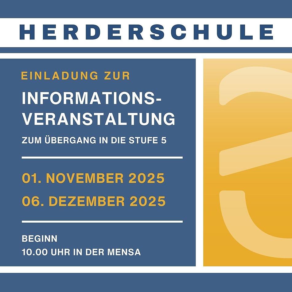 Damit ihr euch gemeinsam mit euren Eltern über das Angebot der Herderschule informieren könnt, laden wir euch und Sie herzlich am Samstag, dem 01. November 2025, oder am Samstag, dem 06. Dezember 2025, jeweils von 10.00 Uhr bis 13.00 Uhr zu einer Informationsveranstaltung ein.