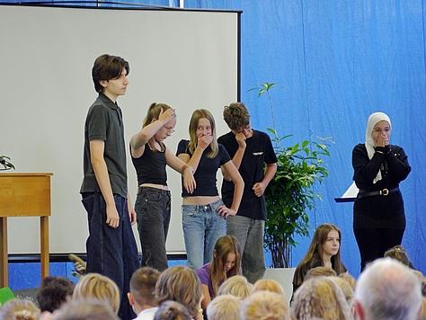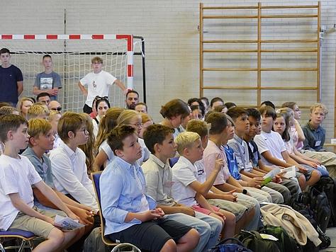 Nach einer Begrüßung durch den Schulleiter, Herrn Tross, die stellvertretende Schulleiterin Frau Demper, Frau Achterberg vom Schulelternbeirat und die Schulsprecherin, Carina Degenhardt, gingen die neu gebildeten Klassen mit ihren Klassenlehrerinnen und -lehrern in die erste Unterrichtsstunde im Klassenraum, um mit den Bauarbeiten am Projekt "Gymnasium" zu beginnen.