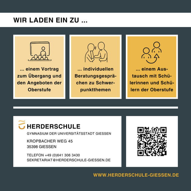Wir freuen uns auf Eure und Ihre Teilnahme an unserer Informationsveranstaltung und stehen für diesbezügliche Fragen vorab gerne zur Verfügung (sekretariat(at)herderschule-giessen.de).